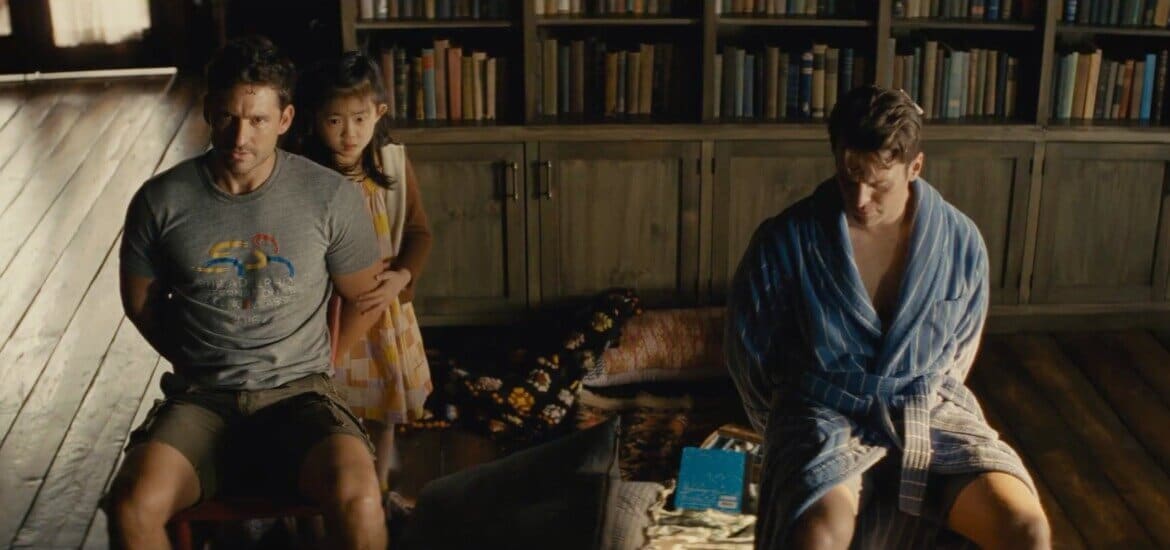 Prendiamo il finale: la soluzione del film è semplice e straniante: i quattro personaggi che hanno bussato alla porta hanno ragione, sono i cavalieri dell’Apocalisse e, solo col sacrificio di Eric, il mondo sarà salvato. Semplice e lineare.