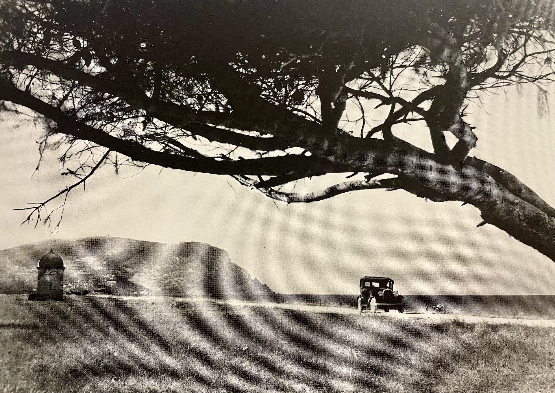 Il paesaggio che fa al contempo da sfondo e struttura, l’incontro tra mare e montagna, tra sacro (il tempietto) e scienza (l’automobile), tra senso di velocità e stasi, il tutto tagliato da un pino in primo piano piegato costantemente dalla bora. Futurismo eclettico e liquido.