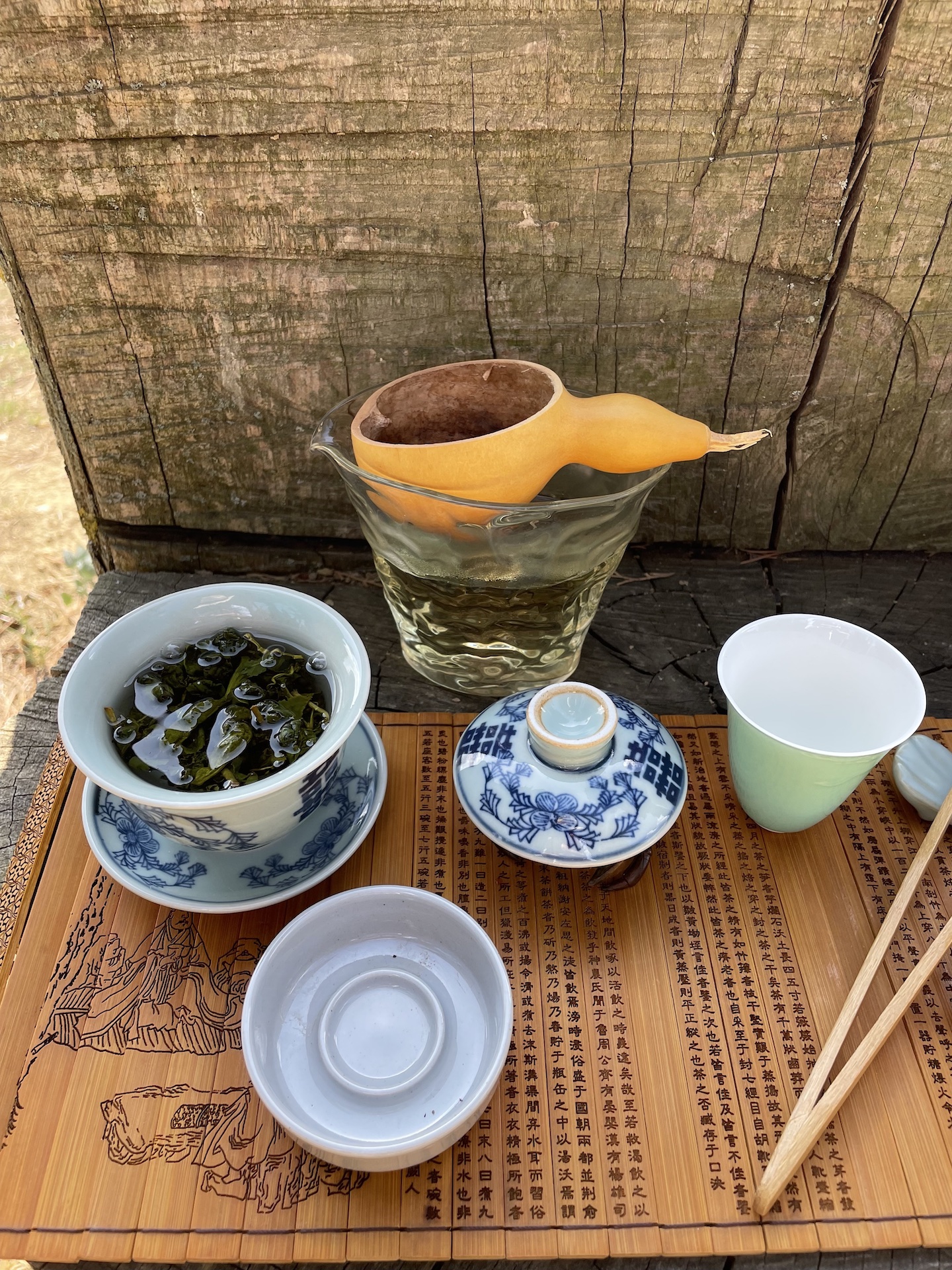Iniziano a comparire gli attori della scena: una gaiwan, filtro, tazze e finalmente il tè: un Da Yu Ling 100k, un tè oolong di Taiwan in uno dei giardini coltivati a tè più alti del mondo (circa 2500 metri s.l.m.). Un tè rarissimo che combatte contro le difficoltà dell’altura e tutti i suoi pregi/limiti. Recuperata l’acqua dal pozzo il TÉologo ErranTe procede a portarla alla corretta temperatura per l’infusione.