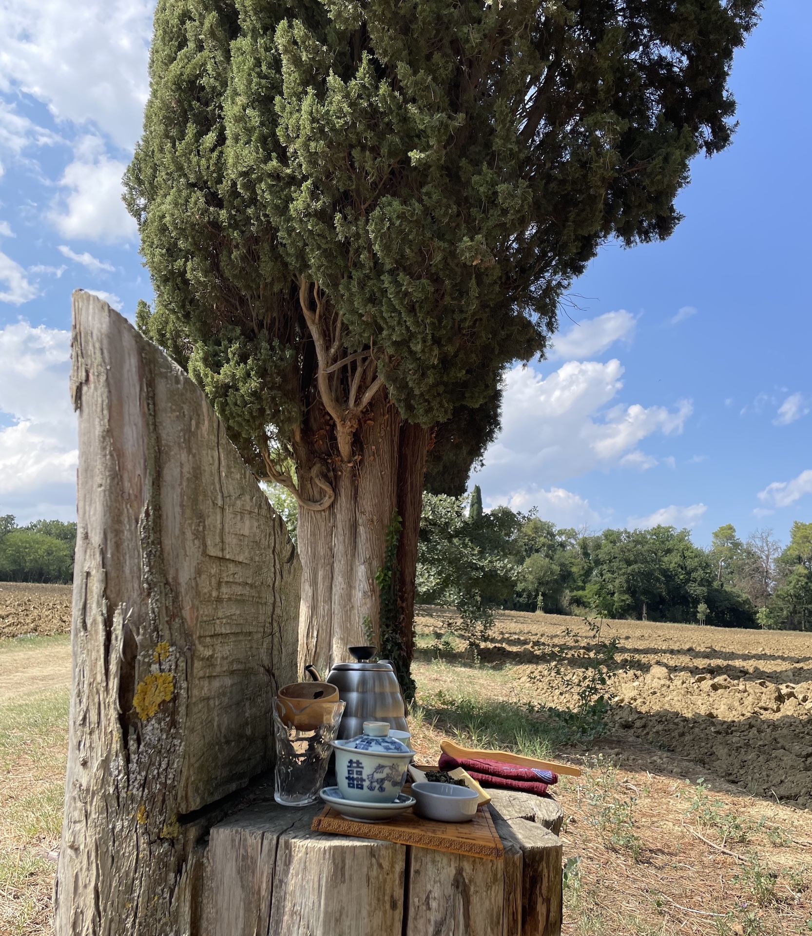 Le vibrazioni dei cipressi in un tono ondulatorio come dentro un quadro di Van Gogh, la vista all’orizzonte tremula dal calore, il silenzio circostante di chi “non ha voce in capitolo”, fanno da sfondo e contorno all’infusione del tè.