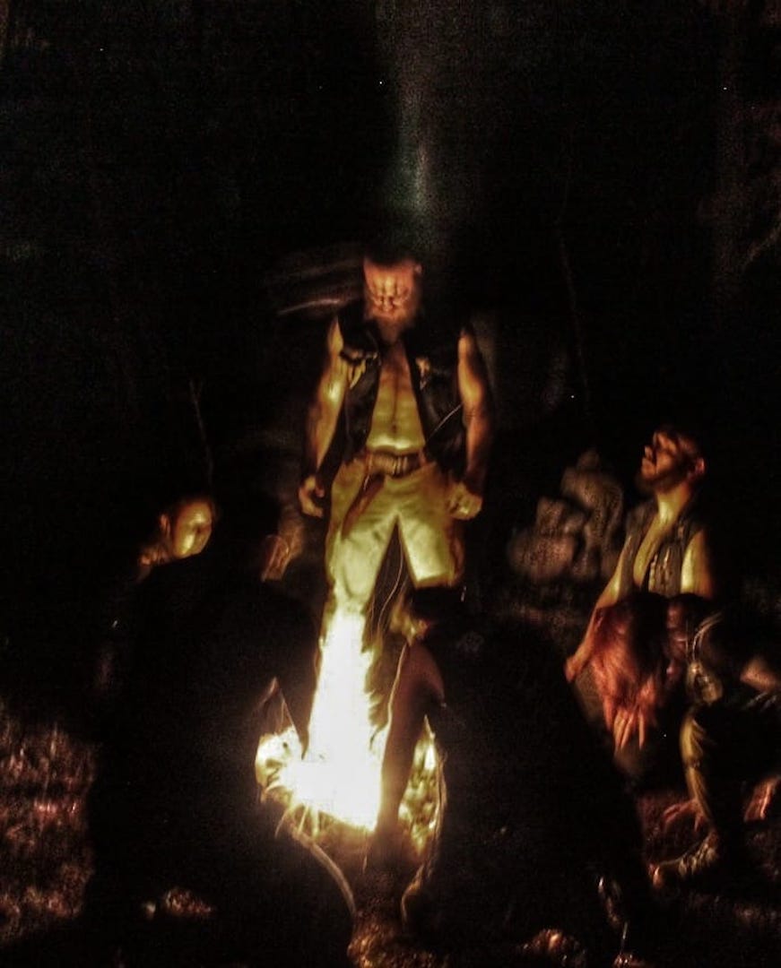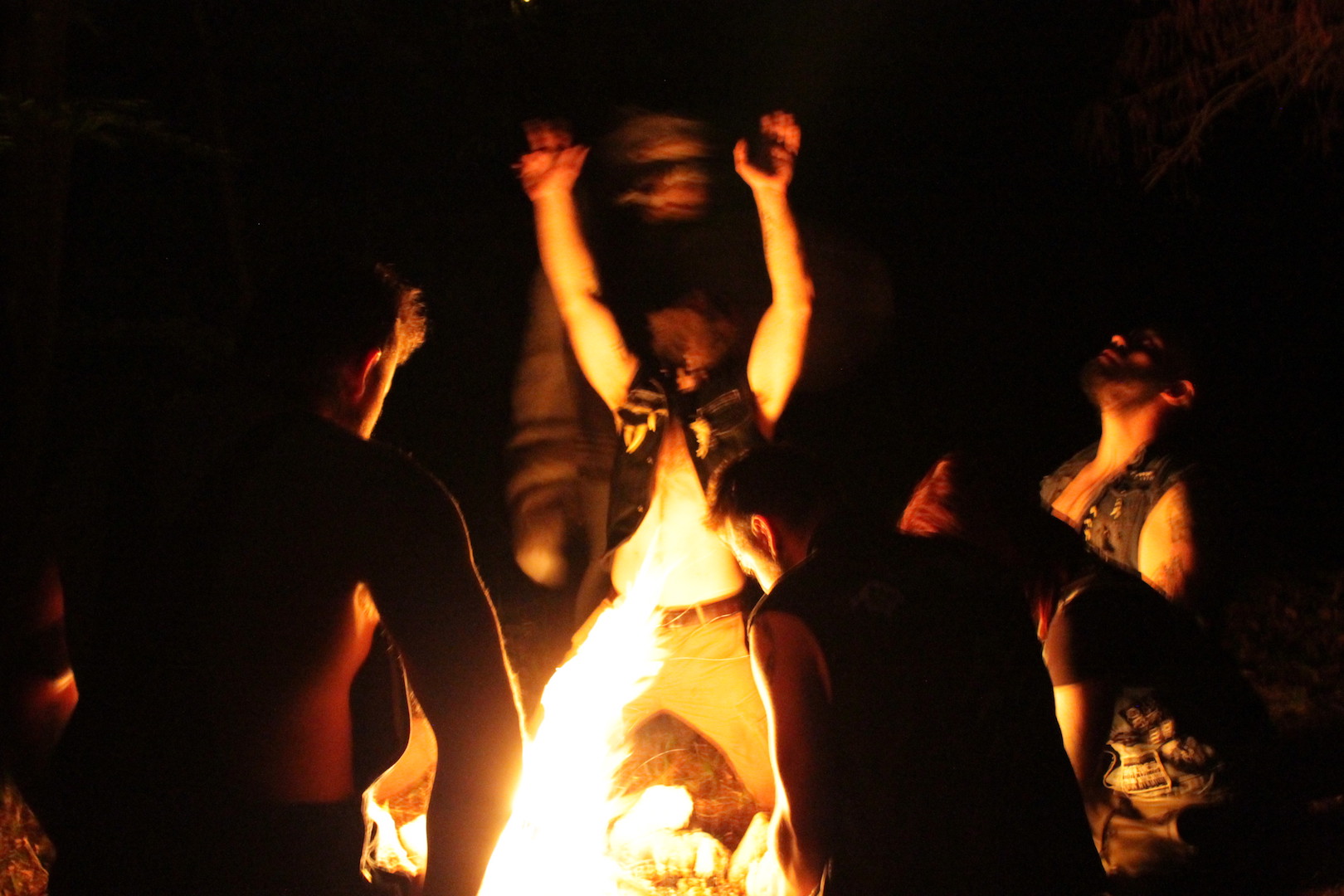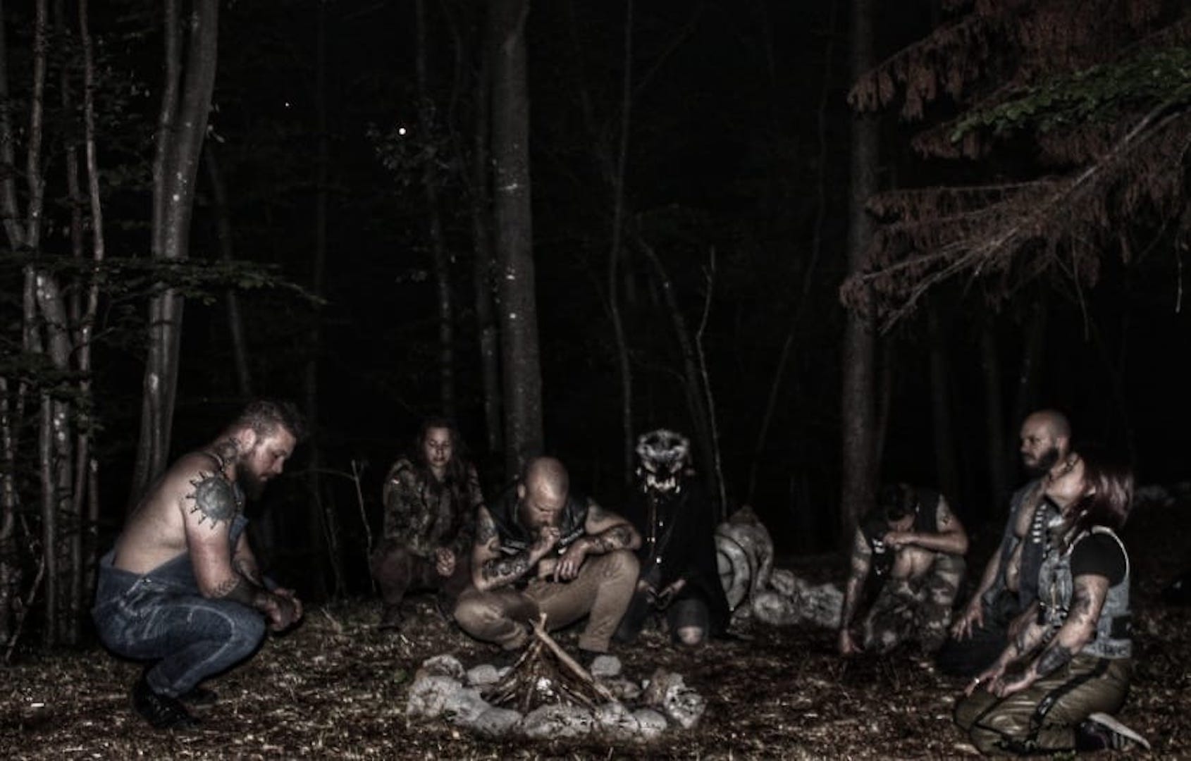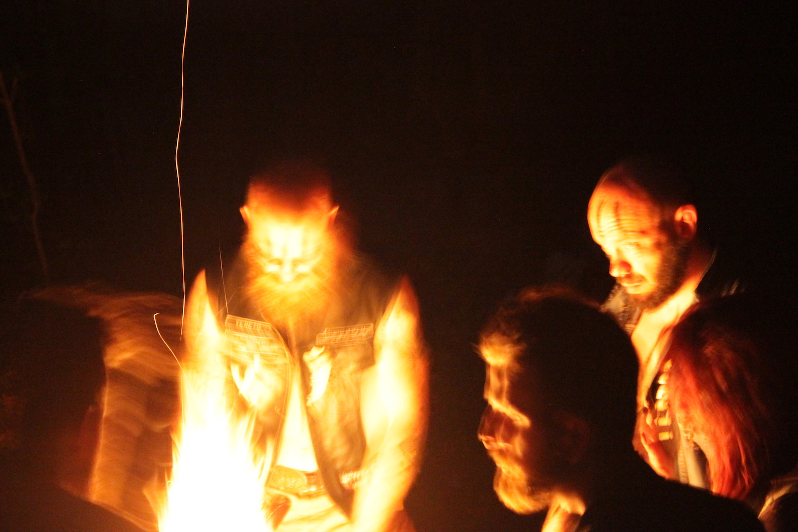 Il momento più alto, intenso, dopo la giornata di sforzi e prove, a digiuno, è stato il rituale, in cui l’uomo è diventato lupo e ha camminato tra altri uomini. Una notte di luna nera, che ha trasformato il bosco di un fondo di sacco in cui ogni rumore era un segnale della vita che lo compone. Il fuoco, alto, i volti dipinti, i corpi sudati e le facce trasmutate della tribù che ci annusava, ci vagliava, il respiro e i suoi crescendo, il furore e le urla, i colpi inferti da due membri che incanalavano quella frenesia sacra che scendeva nei guerrieri durante la battaglia, i colpi sordi sui corpi, gli ululati al cielo e il ritorno all’umanità sacralizzata; il richiamo atavico al Lupo, alla storia, a chi non dobbiamo essere e a cosa dobbiamo aspirare… non ci sono parole per lo stato di euforia dell’anima che i Dire Dogs hanno creato, per l’ascesi ritrovata e che si è consumata davanti al bivacco, tra risate, musica e cibo. Finalmente simili.