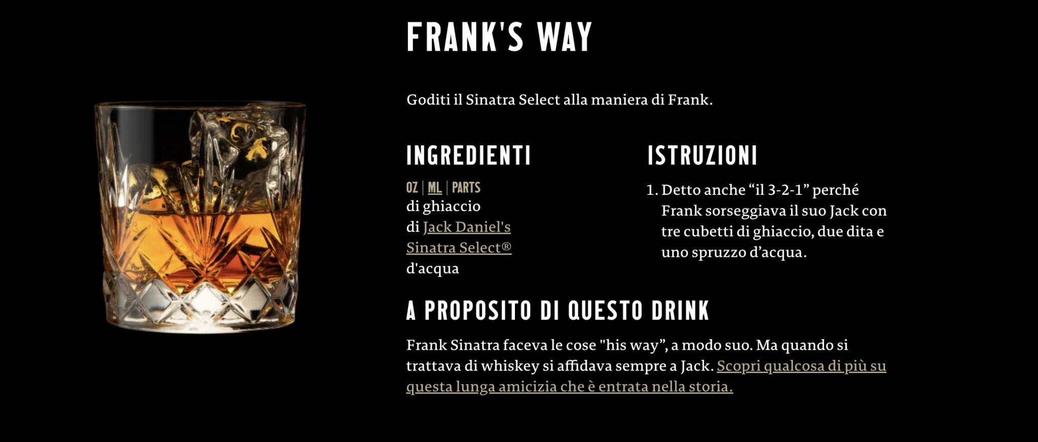 Il buon Jack amava le cose belle e ben fatte e per il suo camino ordinò un preziosissimo marmo italiano. La nave su cui viaggiava venne attaccata dai pirati che distrussero tutto eccetto il marmo che riportava il nome del proprietario. Godendo già all’epoca di un enorme celebrità, il marmo gli venne recapitato a casa come segno di stima da parte dei predatori del mare, che normalmente non si facevano scrupoli se non per l’uomo che regalava loro sbronze colossali. Il SITO è veramente ben fatto e nella sezione ricette dedica a Frank un cocktail: il my way! Detto anche 3- 2- 1 poichè l’artista italo-americano lo sorseggiava con 3 cubetti di ghiaccio, 2 dita di Whiskey Select e uno spruzzo d’acqua.