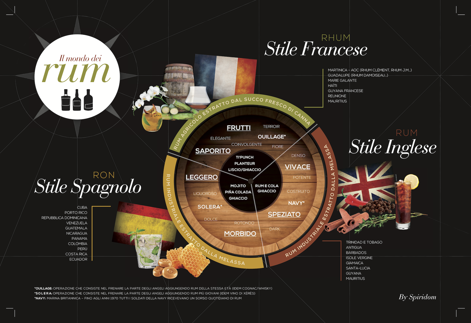 L’evento che ha forgiato, in maniera decisiva, l’identità del rum è stato il colonialismo; a cominciare dalla grafia e pronuncia del nome, passando per l’articolazione geografica, fino alle metodologie produttive tuttora in vigore, l’epopea del distillato può essere considerata la trasposizione della spartizione, e della lotta per la supremazia, perpetrate nei Paesi dell’America Centrale e Meridionale bagnati dal Mar dei Caraibi, da tre grandi protagoniste di questa cruciale vicenda storica: Inghilterra, Francia e Spagna.